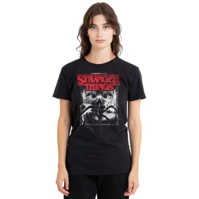 STRANGER THINGS - SEASON FIVE LADIES T-SHIRT FOR WOMEN: Crafted from premium ringspun cotton, our T-shirts are the epitome of timeless style. Embrace your individuality with a look as distinct as you are. Created for everyday wear, our tees feature a breathable all-season mid-weight weave, ensuring comfort in a versatile tagless design. Beyond ordinary, our short-sleeve tee is built to last. VERSATILE FIT: Whether you're an icon, influencer, or a myth in the making, discover a facet for every version of yourself. Pre-shrunk for the perfect fit, our tees are meant to be worn daily. With a crew neckline, short sleeves, regular silhouette, and straight hemline, this top is designed for comfort. Casual and classic, it's the ideal choice for any occasion. Only good vibes here. OFFICIALLY LICENSED - Discover exeptional style with our officially licensed pop culture designs! Created by our in-house graphic art team, each piece is a proud representation of craftsmanship, meticulously designed and printed in the UK. Showcase your favorite characters and themes, making every wear a statement of your unique style! EFFORTLESS CARE: From school and work to hanging out with mates, our classic women's tee is tailored for the real world. No complicated care instructions – simply wear, wash, repeat. Launder cold and tumble or hang dry to maintain the longevity of your new favourite shirt. PERFECT GIFTING OPTION: Ideal for sharing the love, our thoughtfully crafted and vividly rendered T-shirts are perfect for any superfan. Kit your loved ones out for their next birthday, holiday, themed event, Christmas or special occasion.
