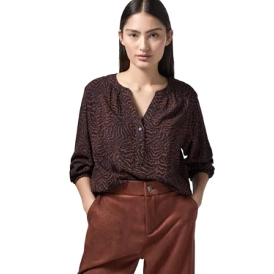Long sleeve blouse Slit crew neck Long sleeve with cuffs and button Rounded hem Graphic pattern