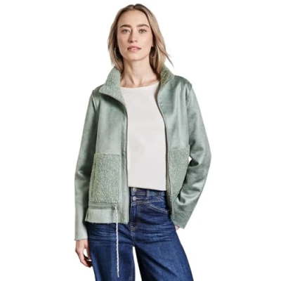 Jacket with teddy details Stand-up collar Side pockets with zip Drawstring hem Soft feel