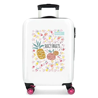 Carry-on suitcase dimensions 38 cm x 55 cm x 20 cm. It has a capacity of 34L and weighs 2.6 kg. Made of ABS, a light and resistant material. Inner with straps on one side and a zippered compartment on the other side. Four dual multidirectional spinner wheels for a comfortable displacement, smooth running and easy mobility. Side combination padlock to increase security By Enso.