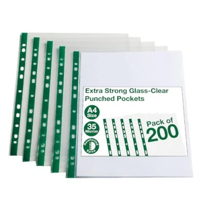 File your notes and papers in these lightweight, polypropylene punched pockets The glass clear material will allow you to easily see what's inside, whilst protecting your documents The multi-punched spine allows you to file the pockets away easily in an A4 binder or folder; an essential for any office, school, college or university work 35 microns, Pack of 200