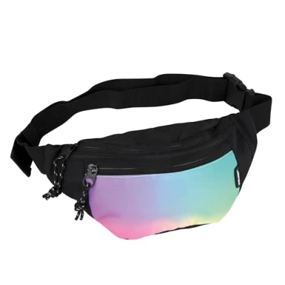 Waist bag with adjustable ribbon. Sunset Series - Black A combination of gradient colors inspired by the sunset, accompanied by black and white details. Zipper pulls with rope. Two front pockets and one back. Ripstop outer fabric: lightweight and resistant to breakage and tears. It uses a special technique that weaves thick reinforcement threads at regular intervals in a crisscross pattern. Fabric composition: outer and polyester inner lining. Dimensions: 30 x 15 x 8.5 cm.