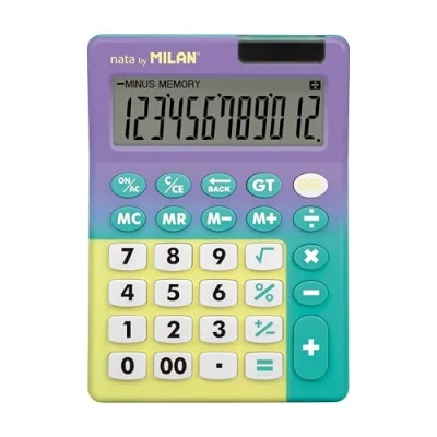 12 Digit Desktop Calculator, Sunset Series. 4 memory keys, square root function, large total function and backward function. Off key. Dual power: solar cell and 1.5V battery. Lilac, Turquoise and Yellow Original design created by the R&D department of MILAN. Calculator measurements: 11.7 x 16.3 x 3.8 cm.
