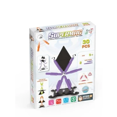 Welcome to the enchanting world of Supermag Projects, where the magic of magnets brings all kinds of constructions and structures to life! Introducing the Supermag Projects Technicolor line, where sleek and sophisticated design meets magnetic magic! This high-tech collection consists of black and grey plastic elements, combined with vibrant neon colored rods. The result is a visually stunning and futuristic effect that will captivate children with a penchant for a sleek and sophisticated look. Prepare for an extraordinary building experience as you dive into the world of Supermag Technicolor, where imagination and innovation meet. Unleash your creativity with the Supermag Technicolor 30-Piece Starter Kit. This set includes the same components as the multi-coloured version, with 6 short bars, 4 circles, 4 rings, 10 metal balls, 4 triangular plate halves and 2 square base halves. The plastic elements are black and grey, while the neon colored rods give a futuristic touch. Build and create structures with a sleek and refined aesthetic, combining form and function in a remarkable way. Get ready to embark on a magnetic journey full of innovation and style with the Supermag Technicolor 30-Piece Starter Kit!, Manufacturer: Supermag