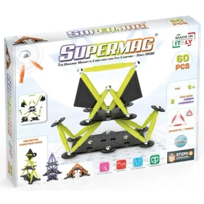 Welcome to the enchanting world of Supermag Projects, where the magic of magnets brings all kinds of constructions and structures to life! Introducing the Supermag Projects Technicolor line, where sleek and sophisticated design meets magnetic magic! This high-tech collection consists of black and grey plastic elements, combined with vibrant neon colored rods. The result is a visually stunning and futuristic effect that will captivate children with a penchant for a sleek and sophisticated look. Prepare for an extraordinary building experience as you dive into the world of Supermag Technicolor, where imagination and innovation meet. Stimulate your imagination with the Supermag Technicolor 60-piece large set. This impressive collection includes 8 short bars, 7 long bars, 12 circles, 4 rings, 19 metal balls, 4 triangular plate halves and 6 square base halves, all in striking black and grey plastic with neon colored rods. Unlock a world of endless building possibilities while creating moving objects and dynamic shapes with a sleek and high-tech aesthetic. The Supermag Technicolor 60-piece large set is perfect for young builders looking for an advanced building experience that combines innovation and style!, Manufacturer: Supermag