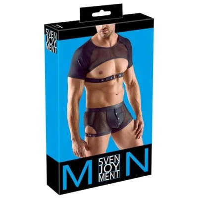 Open chest, crop top with short sleeves Stylish matte look material with a net insert at the front Adjustable strap underneath the chest Decorative ring & press studs Soft & stretchy for a very comfortable fit
