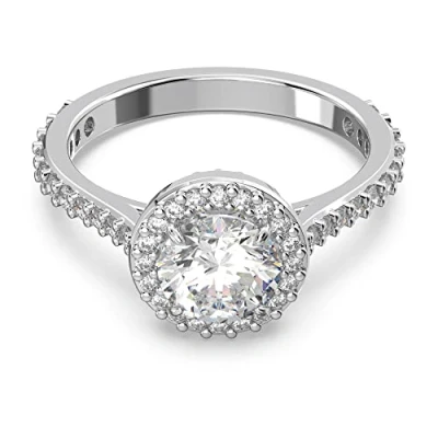 Size:18 An expression of elegant sophistication: the Constella line impresses with a sparkling cocktail ring with a refined design that catches the eye and goes with any outfit Meticulous Workmanship: The jewel features a brilliant clear stone in the centre and is enhanced by pavé on the gallery and rhodium plated band for a striking effect ART MEETS IMAGINATION - The bright ring makes fairy tales with any combination, whether worn alone or paired with other jewellery from the Constella family Capture hearts: For all dreamers, the Constella cocktail ring is a particularly eye-catching gift idea to give to special people Box contents: 1 x Swarovski Constella Coktail Ring, with Swarovski White Cubic Zirconia Round Cut and Classic Pavé, Rhodium Plated, Size 50 Swarovski