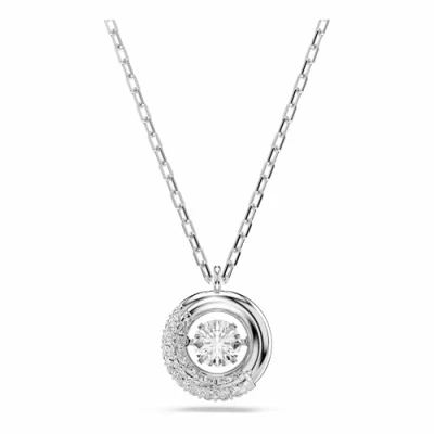 Length: 38 - 45 cm; Motif Size: 1.4 x 1.2 cm; Clasp Type: Lobster Mesmerising Design: This rhodium-finished pendant necklace features a shimmering central hoop half encrusted with clear pavé crystals and a dancing Swarovski stone placed at the centre Bold Style: Blending refined craftsmanship with radiant sophistication, this dazzling necklace elevates your look with a striking touch of glamour for both everyday wear and evening occasions Joyful Extravagance: Wear this head-turning statement piece on its own or pair it with other chic items from the Swarovski Dextera collection for a look that exudes pure confidence Designed to Last: Swarovski jewellery maintains its brilliance when simple care practices are observed; remove before contact with water, lotions or perfumes and polish with a lint-free cloth Items Delivered: 1 x Swarovski Dextera pendant necklace with clear round-cut dancing stone and clear pavé crystals in a rhodium-finished setting; 1 x Swarovski necklace box