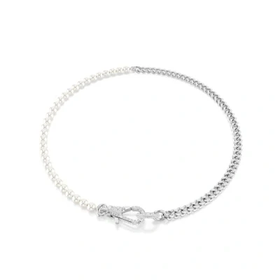 This rhodium-plated necklace balances industrial chic with modern elegance The striking design combines a classic Dextera necklace with strung white Swarovski crystal pearls The focus is on a distinctive carabiner clasp in clear crystal pavé You can wear this skilful mix of power and elegance every day
