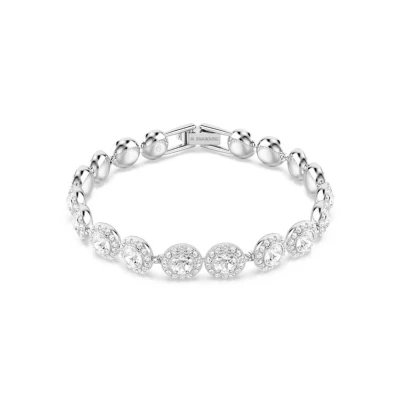 Minimum Length: 15.5 cm: Maximum Length: 17.8 cm; Width: 0.8 cm; Clasp Type: Fold Over Bold Opulence: Wrap your wrist in light with this luminous clear tennis bracelet, featuring individual links set with a brilliant central stone and a halo of smaller round-cut crystals Sophisticated Style: A sparkling and elegant way to inject a touch of ethereal style into any outfit, this bracelet combines the luminous quality of Swarovski jewellery with the classic essence of beauty Sleek Sophistication: Embellished with meticulously-cut Swarovski crystals, this statement piece from the Una Angelic collection celebrates the essence of individuality with every facet Designed to Last: Swarovski jewellery maintains its brilliance when simple care practices are observed; remove before contact with water, lotions or perfumes and polish with a lint-free cloth Items Delivered: 1 x Swarovski Una Angelic tennis bracelet with clear round-cut crystals in a rhodium-finished setting; 1 x Swarovski bracelet box