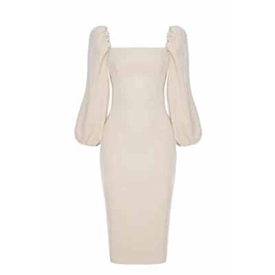 A dress with a tight fitting pencil cut The classic and elegant Giselle dress is a must have for any wardrobe. The Giselle dress easily converts from an elegant pencil dress to a very sexy dress for a wedding or date. The dress has a tight fitting pencil cut. Puff sleeves that are finished with an elastic band can be cleverly modified - we can wear them like in a classic dress or we can lower them up to the shoulders for a "Spanish" effect Size: 38 (M) | Material: Polyester, Elastane | Dry Clean Recommended