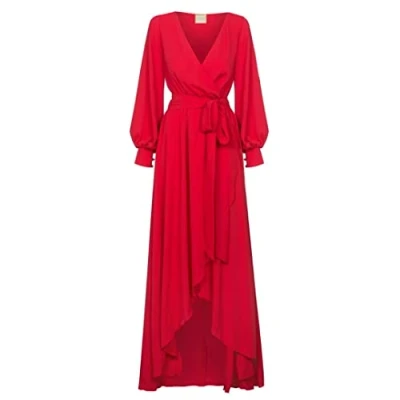 Red long dress with shorter front Irmina Red Swing. A beautiful, airy dress made from a lightweight fabric in red. Asymmetrical cut - elongated at the back and shorter and slit at the front. Decorative cuffs on the sleeves and decorative waistband. Slightly loose blouson top. The dress looks phenomenal in natura. Size: 40 (L) | circumference of bust: 94-100 cm | circumference of waist: 66-86 cm | length of back: 158 cm | material: 100% polyester
