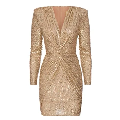 Sequin dress with eye-catching layered front by Dolores by Swing. Glitter Sequin Embroidered Dress The material is stretchy and adapts very well to the body. The strikingly layered front of the dress gives it a special touch. The front of the dress has a strong neckline up to the bra line. Dress with zip. Embroidered concealed padding accentuated shoulder line. Dry clean recommended. Size: 34 (XS) | Material: 100% Polyester
