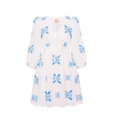 Dress made of airy cotton, decorated with embroidery. The dress has a lining. Lining composition: 100% viscose. Mini length dress. The dress has a deep neckline that closes with a Velcro fastener. The dress has trousers at the waist, so you can emphasise your waist more or less. The dress is perfect for summer parties and outings. Outer material: 100% cotton. The dress is available in sizes 36, 38 and 40 and was made in Poland. We recommend dry cleaning.