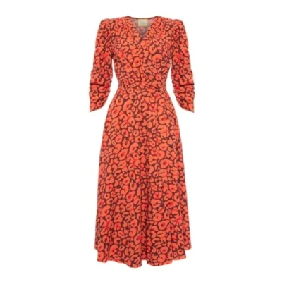 Elegant design: delicate midi dress with an appealing orange animal print on a brown background that provides an eye-catching look. Bodycon Silhouette:The turn-over layered dress perfectly accentuates the waist and provides a flattering fit. VERSATILE V NECK The V neck and 3/4 sleeves with decorative pleat at the end add a feminine touch to the dress. PERFECT FOR ANY OCCASION: Perfect for everyday wear, the office or a night out with friends - versatile for any occasion. HIGH QUALITY CRAFTSMANSHIP Made from 100% viscose and made in Poland, the dress offers both comfort and style. Available in sizes 8 to 16.