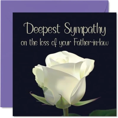 SEND YOUR HEARTFELT AND SINCERE CONDOLENCES: This exceptional quality sympathy cards for her shows the design " Deepest Sympathy on the loss of your Father in law". If you are looking for deepest sympathy cards for him or her, then this condolence gifts is bound to make them appreciative. Not just for a bereavement gift this could also be a sorry for your loss card. WHAT DO YOU GET: The card is printed on one side and BLANK ON THE INSIDE to allow you to write your very own message. The unique design is printed on a specially sourced and environmentally responsible board. At 360 microns thick the natural white one-sided gloss board has a quality look and feel. Supplied with a coloured gummed envelope to complement the design and ready to be sealed and sent in the post. NO INK SMUDGES: There is nothing worse than writing inside a card to find that the shiny surface makes the ink smudge. This is why we use a high quality one sided coated board. The uncoated side will absorb more of the ink from your pen to make smudging a thing of the past. SIZES: Greeting Card = 145mm x 145mm, Envelope = 155mm x 155mm, Card Thickness = 360 micron. Thoughtful sympathy cards, thinking about you condolence card, Sorry card, thinking of you gifts sympathy gift. MADE AND QUALITY CHECKED IN THE UK: We print and manufacture all our product right her in the UK so you can be sure of a fast turnaround and a product that is expertly made. Using environmentally responsible premium board our card is conscious of the responsible management of the world's forests.