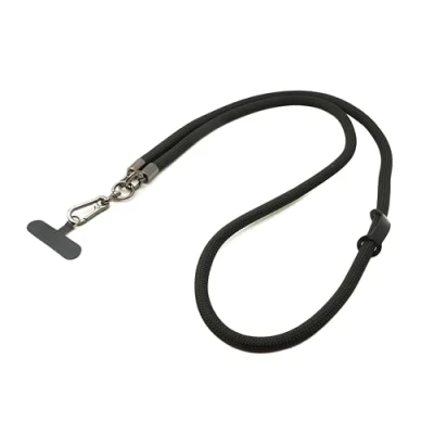 Variably adjustable neck strap for attaching to smartphone cases Attachment via telephone tether pad (approx. 6.0 x 2.5 cm) - extra thick band (diameter: approx. 1 cm) Note: The strap is only compatible with hard plastic cases and closed bottom. Loop diameter: approx. 65 cm (variably adjustable). Colour: black. Strap material: nylon, TPU Product weight: 75 g. Package weight: 4 g (poly bag). System-S model number: 84505507