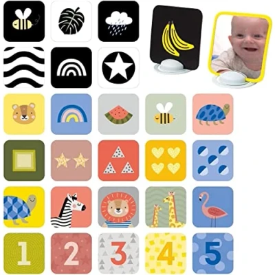 Double-sided activity cards specially designed for babies from birth! The illustrated cards offer activities corresponding to three phases of baby's development Phase 1 – 0 m+: the black and white cards allow the baby to focus on an image and be stimulated. Encourages baby to play on their side, stomach and turn their head Phase 2 – 3 m+: on the back, the coloured cards and the mirror allow baby to develop their visual perception Phase 3 – 12 m+: allows the baby to identify numbers and quantities Includes 15 double-sided cards, a safe baby mirror and 2 holders to hold cards upright and allow baby to play on their stomach. Card size: 13.5 x 13.5 cm, Manufacturer: Taf Toys