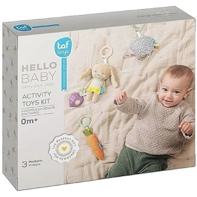 A set of three hanging toys for baby's first months Carrot: Plush with textured and ruched fabric Rabbit: Plush with beet teether Hedgehog: Plush with textured fabric and marble rattle Easy to grasp for little hands; easy to hang with plastic ring; from birth