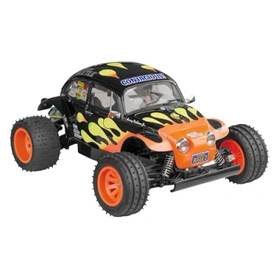 Tamiya branded model assembly radio control kit car. An ESC (Electronic Speed Controller) and 540-brushed type motor are included. Required to complete: two-channel radio control unit, steering servo, 7.2 volt battery & battery charger, and Tamiya TS Paint This is a 1/10 scale R/C assembly kit of the Blitzer Beetle, which was inspired by the exciting off-road desert racer designs seen in the United States. The proven chassis is equipped with 4-wheel double wishbone suspension, CVA shock units, and high-grip off-road tyres to offer superb driving performance on rough terrain. The injection moulded body features metal-plated light covers and side mirror parts for greater realism. In addition, a driver figure as well as a sticker sheet to depict the fiery splash-pattern livery are also included. This tough, lightweight ABS bathtub chassis features a rear-mounted motor, rear-wheel drive layout. The fully enclosed gearbox protects against dirt and debris and is equipped with differential gears to offer smooth cornering. Four-wheel independent double wishbone suspension is equipped with C.V.A. shock units and extremely durable monocoque-type lower arms. The front spiked tyres feature three ribs for enhanced stability, while the rear tyres feature both spikes and an X-shaped tread pattern along the centre to ensure high levels of grip. Length: 394 mm. Width: 295 mm. Height: 182 mm. Wheelbase: 260 mm., Manufacturer: Tamiya