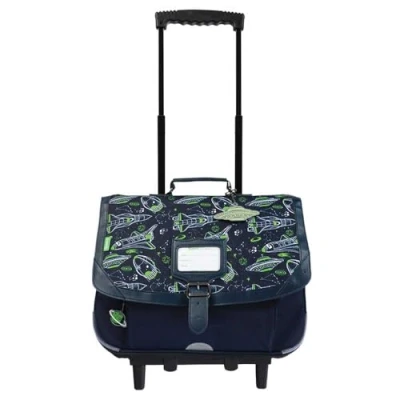 Trolley 38 cm suitable for primary school classes from CP to CE2. Heavy duty and built to last. Eco-friendly material: high-quality polyester from recycled plastic bottles. Water resistant material. Trolley equipped with 2 compartments that can accommodate 24 x 32 cm notebooks and documents in A4 format. Front zip pocket Reinforcements in corners and under the school bag. 2 x 2 wheels Reflective on the front, sides and back of the school bag Ergonomic and comfortable back and shoulder straps