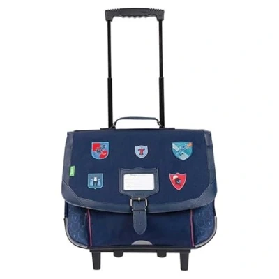 Trolley 38 cm suitable for primary school classes from CP to CE2. Heavy duty and built to last. Eco-friendly material: high-quality polyester from recycled plastic bottles. Water resistant material. Trolley equipped with 2 compartments that can accommodate 24 x 32 cm notebooks and documents in A4 format. Front zip pocket Reinforcements in corners and under the school bag. 2 x 2 wheels Reflective on the front, sides and back of the school bag Ergonomic and comfortable back and shoulder straps