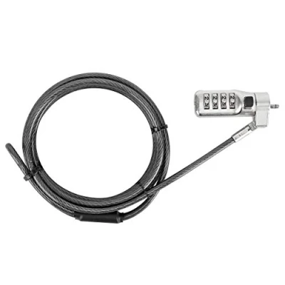 Easily attaches to any notebook computer equipped with any security lock slot This lock ships with 3 interchageable heads- to fit legacy (T-Lock), Compact (Nano) & wedge shaped lock slots Use the colour coding to identify the right tip for the device Pre-set 4 wheel combination lock with a potential 10,000 possible settings to deter theft. No compromise: once locked, the jaws secure the hardware while metal cams secure the jaws into the lock. 2m galvanised steel cable
