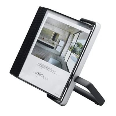 Sleek and professional desktop display Integrates into all professional environments: offices, hotels, shops, public spaces, reception desks, information points Suitable for presenting and protecting everyday documents, brochures, catalogs, price lists, services Includes 10 vertical a4 sleeves, made of PVC with steel wire frame and metal pivots Quick and easy one-click assembly, no tools required