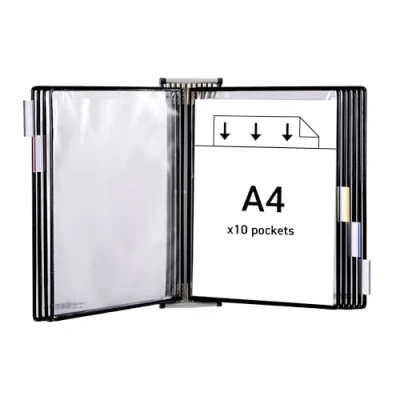 A4 Wall Display Unit with 10 Assorted Pivoting Pockets Sturdy and easy to mount with fixings provided Efficiently communicates important information where it's needed Includes 5 Clip-On Index Tabs for Identification