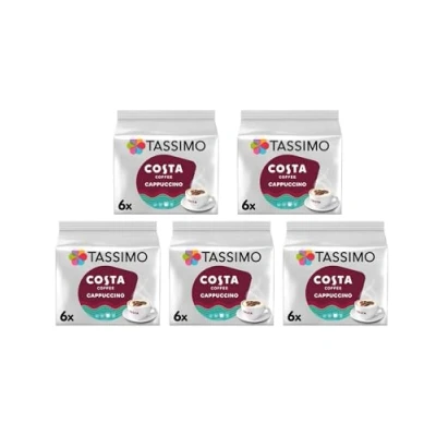 PACK CONTENTS: Each pack contains 12 T-discs making 6 servings of Costa Cappuccino, with 5 packs totalling 60 discs for 30 delicious servings CONVENIENCE: Pre-measured coffee and milk pods ensure consistent, barista-style results with every brew SERVING SIZE: Each cappuccino requires two T-discs - one coffee disc and one milk disc for the perfect coffee-to-milk ratio COMPATIBILITY: Designed exclusively for use with Tassimo brewing systems, featuring intelligent barcode technology STORAGE: Individual sealed T-discs maintain coffee freshness and flavour, with a shelf-stable milk creamer disc