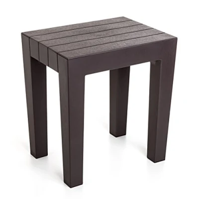 TATAY rectangular stool made of brown textured polypropylene, with a wood effect finish. Anti UV protection, suitable for indoor and outdoor use. Size 38x29x41m5 cm