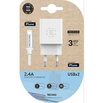 Tech One 2.4 Dual USB Charger + Braided Nylon Micro Cable Apple Length 1 m White