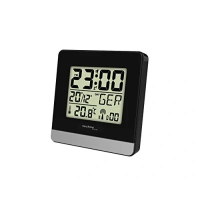 DCF-77 radio clock with manual setting option 12/24 hour time display Date display Calendar display Weekday display in 7 languages Indoor temperature in °C/°F Alarm with repeat alarm Background lighting via touch