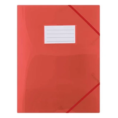 Made from 480μm thick, rigid, ecological polypropylene 3 flaps, semi-transparent, slightly striped, A4 size With 2 flat corner elastic bands in the same colour as the folder with a label pocket and a replaceable label Inner format of the bag: 94 x 56 mm; size: 245 x 315 mm Colour: red