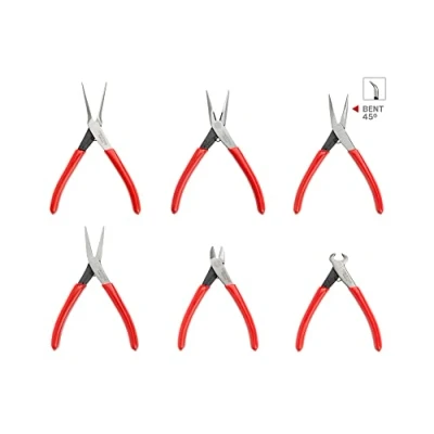 Includes 1 piece. Mini Needle Nose Pliers, 1 piece. 1 x Mini Long Nose Plier Mini pliers, long nose pliers, 1 piece. Mini flat nose pliers; 1 pcs Mini diagonal cutting pliers, 1 piece. Mini cutting pliers. Extra long and thin tapered nose pliers with cross cut teeth for a secure grip in any direction. Versatile Long Nose Plier combines a long, tapered and finely pointed nose with a soft wire cutter, 14-38 AWG. The bent long nose pliers have a 45 degree tip that makes it easy to reach obstacles. Flat nose pliers with wide jaws firmly grip thin parts and offer extra leverage for bending. Diagonal cut pliers and semi-wire end with induction hardened blades (HRC 60-63) cleanly cut soft wires such as copper, aluminum, brass and silver (14-38AWG).