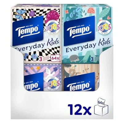 The Tempo Everyday Kids Box – extra strong and uniquely soft: the handkerchief with three layers – the perfect combination of softness and strength. With the Quick & Easy paper opening, always at hand: whether runny nose, allergy or small mishaps – ideal for children, teenagers and the whole family. Five playful cube designs with unique 3D effects - add fun and variety. Usual Tempo quality - soft & strong. Box contents: 1 x megapack Tempo Kids cube box with 12 x 12 boxes each 64 wipes, 3-ply - the practical dispenser box with quick & easy paper opening.