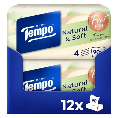 Inspired by natural softness: the particularly skin-friendly paper handkerchief with the natural cream white cloth colour thanks to 30 percent unbleached fibres - in a practical box with attractive designs FSC certified: the fibres of the Tempo natural and soft handkerchiefs come from natural and controlled origin and responsible forest management Machine washable paper - leaves no white lint or scraps of paper: so strong that the tissues can withstand an accidental wash cycle in the washing machine Box contents: 1 x megapack Tempo natural and soft box with 12 boxes of 90 wipes each, the practical dispenser box with QuickundEasy paper opening, cream-beige cloths, 4-ply, dermatologically tested For over 90 years, the brand for reliable hygiene products of high quality for home and travel. The traditional brand for hygiene items for home and on the go brings high-quality toilet paper to the market in addition to paper towels for hygiene and health. Tempo stands for quality you can rely on. All products combine one thing: the unbeatable combination of strength and softness