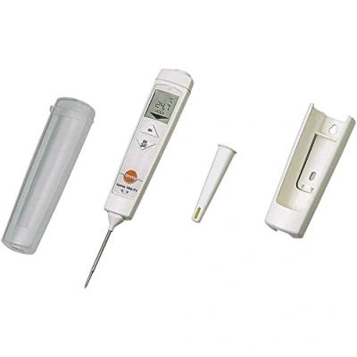Extremely fast results - up to two temperature measurements per second Visual and audible alarm: LED lights up, alarm sounds Slim, rugged measuring tip that leaves hardly visible puncture marks Auto hold: automatic final recognition value Ideal for measuring the core temperature of food: HACCP compliant / EN 13485 certified (when used with the TopSafe protective case) Benefits of the TopSafe protective case: waterproof / dirt resistant (IP67 rated) / dishwasherproof Visual / audible alarm that warn when thresholds are exceeded Further benefits which the TopSafe protective case has to offer: waterproof and dirt resistant, IP67 rated, dishwasherproof Further benefits which the kit has to offer: you have all the accessories you need, i.e. clip and sensor protective cap for safe storage