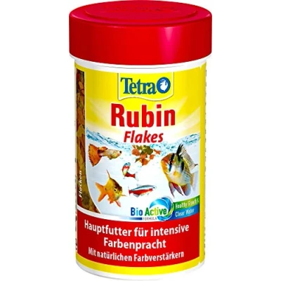 Food mix of three selected flakes for a varied, balanced and healthy diet of all ornamental fish in the aquarium The floating and slow sinking flakes are easy to eat and very digestible, which contributes to clear water and better water quality The feed with a high content of natural colour-enhancing ingredients ensures full colour development for all red, orange and yellow ornamental fish; the colour-enhancing effect is visible after a few weeks The formula with high-quality natural ingredients, without dyes and added preservatives strengthens the resistance and supports healthy growth thanks to protein mix The resealable tin made from recycled materials protects the food against harmful influences such as sunlight, air and moisture - so the important ingredients are protected; Box contents: 1 x 100 ml Tetra Ruby flake food