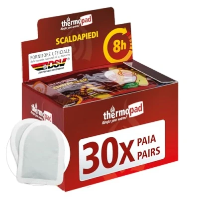 30 PAIRS OF EXTRA WARM PADS: No more cold feet! Our original Thermopad toe warmers provide up to 8 hours of warm feet. With 96 x 70mm the thin toe warmers fit in every shoe, ski shoes and snowboard boots included. READY FOR IMMEDIATE USE: Just open the packaging, warmth is activated by contact with air, heats up to 37°C maximum. No pre-heating necessary. Single use product. Unopened storable for several years. 8 HOURS OF WARMTH: Toe warmers are sticked to the top or bottom of your socks and keep your feet warm for up to 8 hours. Ideal for all outdoor aktivities like skiing, hiking, chasing, football or soccer. NATURAL INGREDIENTS: The pads heat up automatically due to the oxidation of its natural ingredients (Iron powder, salt, charcoal, water and vermiculite). THERMOPAD is the first climateneutral supplier of heatpads in EUROPE. THERMOPAD is OFFICIAL supplier of the German National Ski Team. Hand warmer, toe warmer, foot warmer, neck warmer, body warmer or heat belt - WE KEEP YOU WARM. ALWAYS. ANYWHERE.