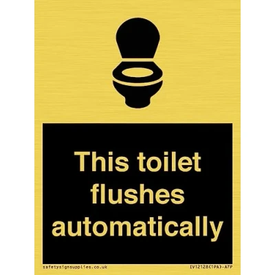 I036 : WC Toilet This sign is made from vinyl gold sticker Gold metal effect sticker for flat, clean surfaces. Not for rough, plastic, or dusty surfaces. A7 portrait Sign Text: This toilet flushes automatically