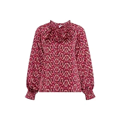 Blouse with all-over print Flowy, wrinkle-resistant material Ruffled stand-up collar Raglan sleeves with ruffled ends Back part longer than front