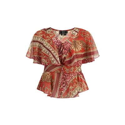 Silky shiny shirt blouse Delicate, semi-transparent material Print with gold metallic threads Renaissance Animal Print V-neck with tie band