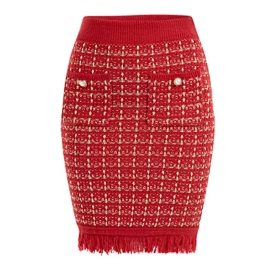 Knitted pencil skirt Feminine bouclé look with metallic yarn Two patch pockets Pockets with buttons in pearl look Wide, elasticated ribbed knit cuffs