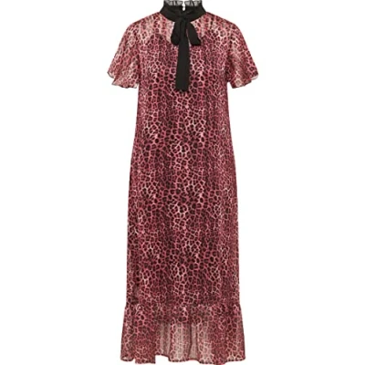 Cap Sleeve Midi Dress Ruffled stand-up collar Tie on collar All-over leopard print with gold-coloured threads Ruffle at skirt hem