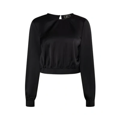 Shiny satin fabric Light stretch content Cut-out back décolleté Waistband with buttons Long sleeves with cuffs
