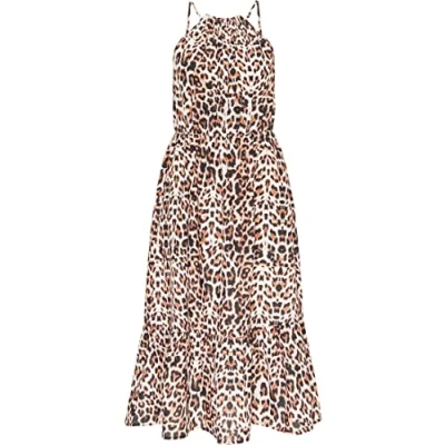 Summer dress with leopard print Lined body part Ruffled stand-up collar with tie band Sleeveless design Skirt part with ruffle