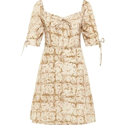 Camouflage print mini dress Wide bardot neckline Off-Shoulder with bow detail Short sleeves with tie details A-line mini skirt