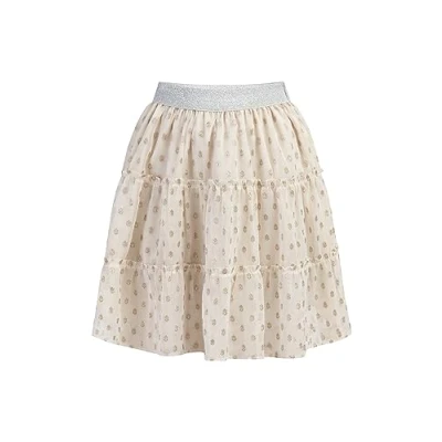 Shiny mini skirt Semitransparent tulle fabric Embroidered with metallic flowers Elastic metallic waistband Tiered Valances