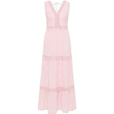 maxi dress with lace Loose flowing material Low back plunge with ribbon Tiered silhouette With inner lining